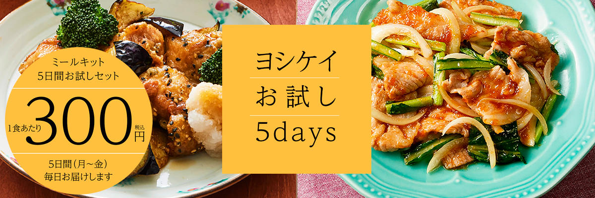 今だけのスペシャルオファー!期間限定お試しクーポンヨシケイをはじめてご利用のお客様に大変お得なお試しセットをご用意いたしました。まずは1週間お試し下さい!