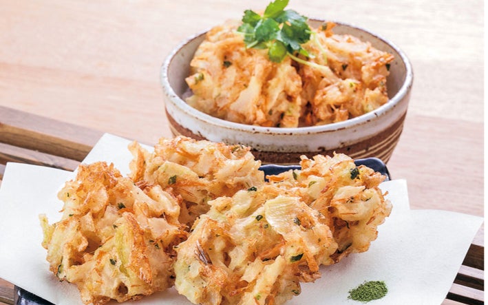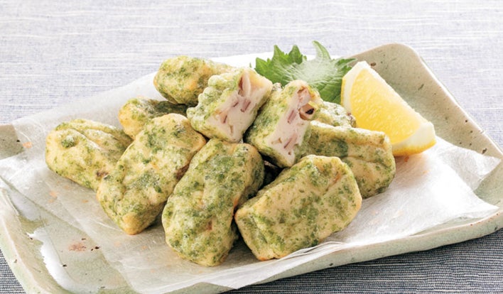 あらぎりのいかと玉葱を魚のすり身と合わせ、あおさを入れた衣で風味豊かに仕上げています。