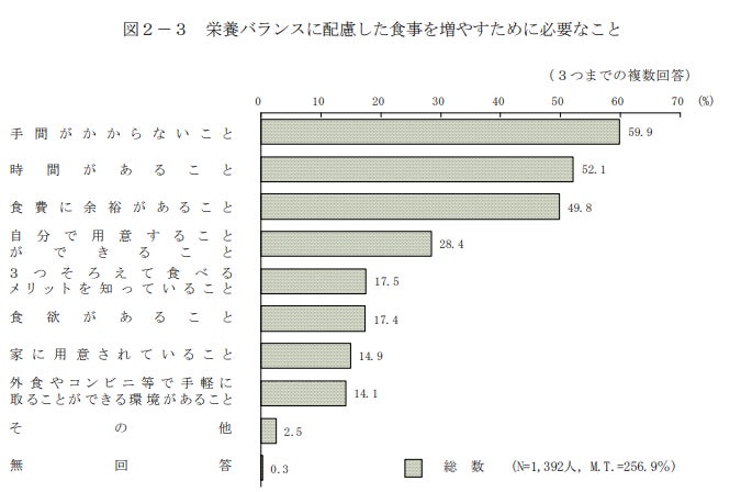 農林水産省令和6年3月食育に関する意識調査によると主食・主菜・副菜を3つそろえて食べる回数を増やすために必要なことを聞いたところ、「手間がかからないこと」を挙げた人の割合が 59.9%と最も高く、次いで、「時間があること」(52.1%)、「食費に余裕があること」(49.8%)の順となっています。