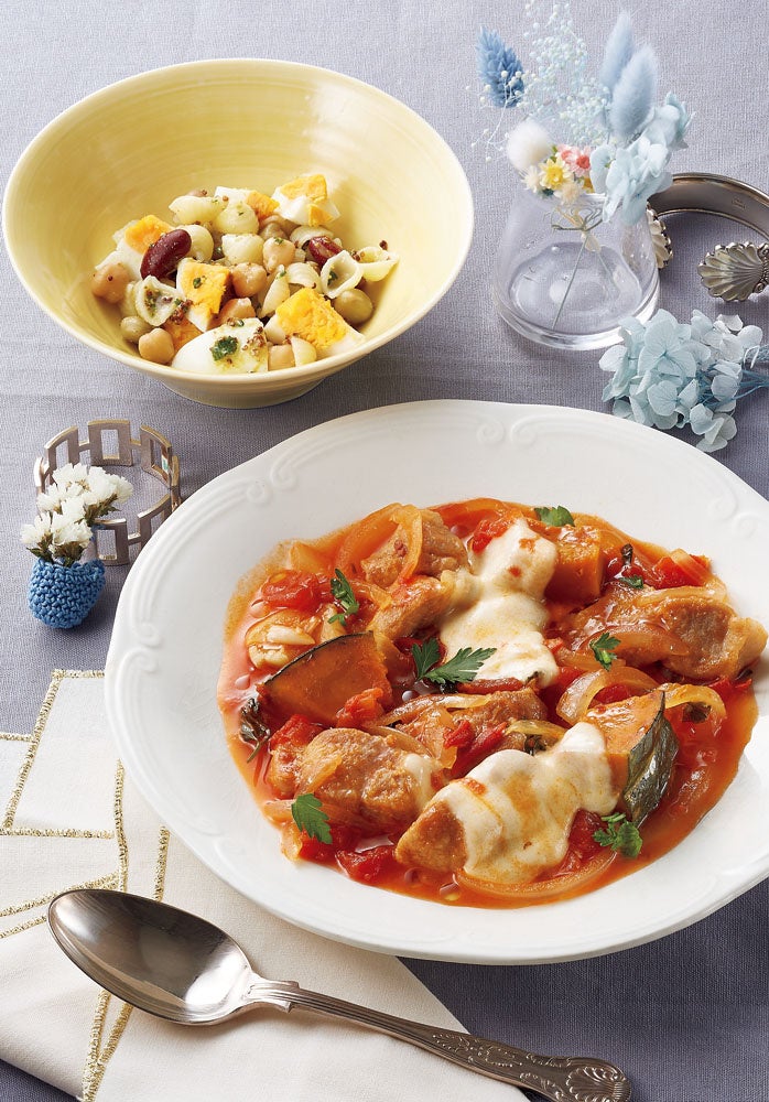 トマトの酸味とハーブの爽やかさで豚肉を美味しく召し上がれます。お好みでハーブの量を調整してください。マカロニサラダはトマト煮込みに入れて一緒に召し上がっていただくのもおすすめです。お好みでお楽しみください。