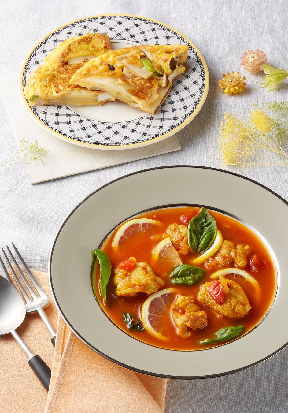 トマト、バジル、カレー粉を使用してスパイシーに仕上げた一品です。バジルの香りとレモンがアクセントになっています。フリッタ-タは厚めに焼きあげるとより一層美味しいです。