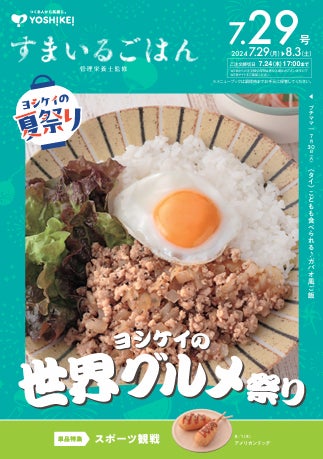 つくる人から笑顔に。をテーマに全国でミールキット宅配サービスを提供するヨシケイグループ(本部所在地:静岡県静岡市 / 代表取締役:井野口 雄一)は、メニューブック「すまいるごはん」7/29号にて「世界グルメ祭り」を開催します。