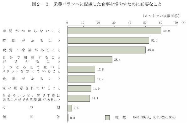 農林水産省「食育に関する意識調査報告書」(令和6年3月)によると主食・主菜・副菜を3つそろえて食べることが1日に2回以上あるのが「週に4~5日」、「週に2~3日」、「ほとんどない」と回答した人に、3つそろえて食べる回数を増やすために必要なことを聞いたところ、「手間がかからないこと」を挙げた人の割合が59.9%と最も高く、次いで、「時間があること」(52.1%)、「食費に余裕があること」(49.8%)の順となっています。つまり栄養バランスに配慮した食事を作るためには手間や時間がかかるとの認識がうかがえます。