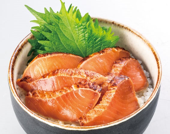 北海道産の秋鮭を刺身用にスライスしてから香ばしく炙り、旨みを閉じ込めた後、醬油ベースの特製タレに漬け込みました。香ばしさに加えて脂の旨み、秋鮭本来の味わいが口の中いっぱいに広がります。