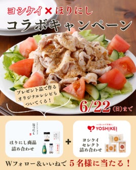 "ほりにし"とのミールキットコラボメニュー発売を記念して、ヨシケイ公式Instagramにてプレゼントキャンペーンを開催します。Wフォロー&いいねをしてくれた方の中から抽選で5名様に「ほりにし商品詰め合わせ」と「ヨシケイセレクト詰め合わせ」をプレゼント。プレゼント品で作るオリジナルレシピも付いてきます。